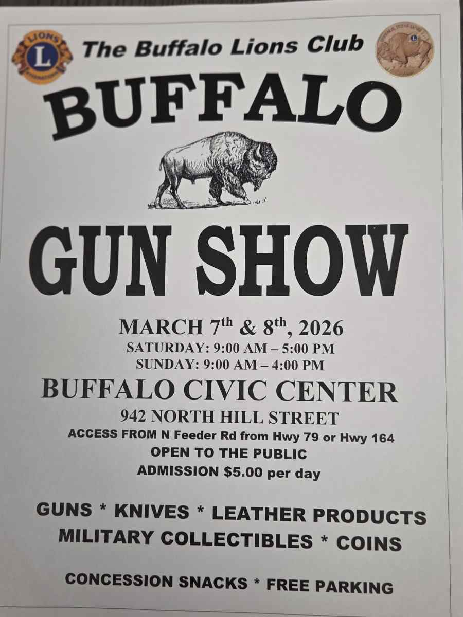 The Buffalo Lions Club Spring gun show/fundraiser will be next weekend March 7th and 8th spread the word come out and meet some nice people with some great deals.